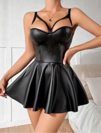 Arias Closet Siyah Etekli Pileli Göğüs Detaylı Fantezi Deri Elbise
