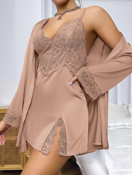 Arias Closet Özel Tasarım Şık Dantel İşlemeli Sabahlıklı 2’li Vizon Saten Gecelik Takımı