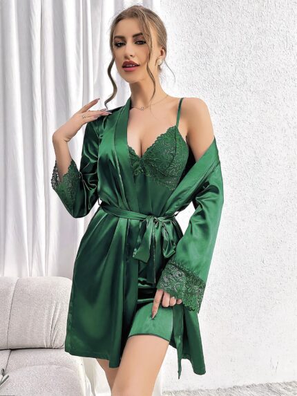 Arias Closet Özel Tasarım Dantel İşlemeli Göğüs Dekolteli Sabahlıklı 2’li Yeşil Saten Gecelik Takımı