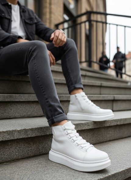BA0713 Bağcıklı Beyaz Yüksek Taban Erkek Tarz Spor Bot