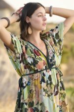 Elbise: Çiçek ve yaprak desenlidir, V yakalıdır, kısa kolludur, bağcık detaylıdır, dokuma kumaştır.