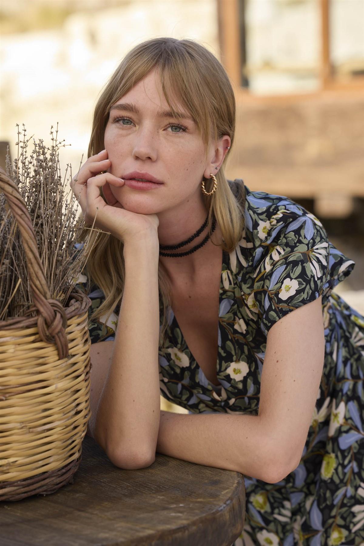 Elbise: Çiçek ve yaprak desenlidir, V yakalıdır, kısa kolludur, önü düğmelidir, dokuma kumaştır.