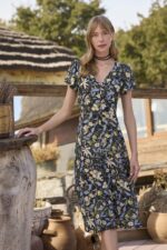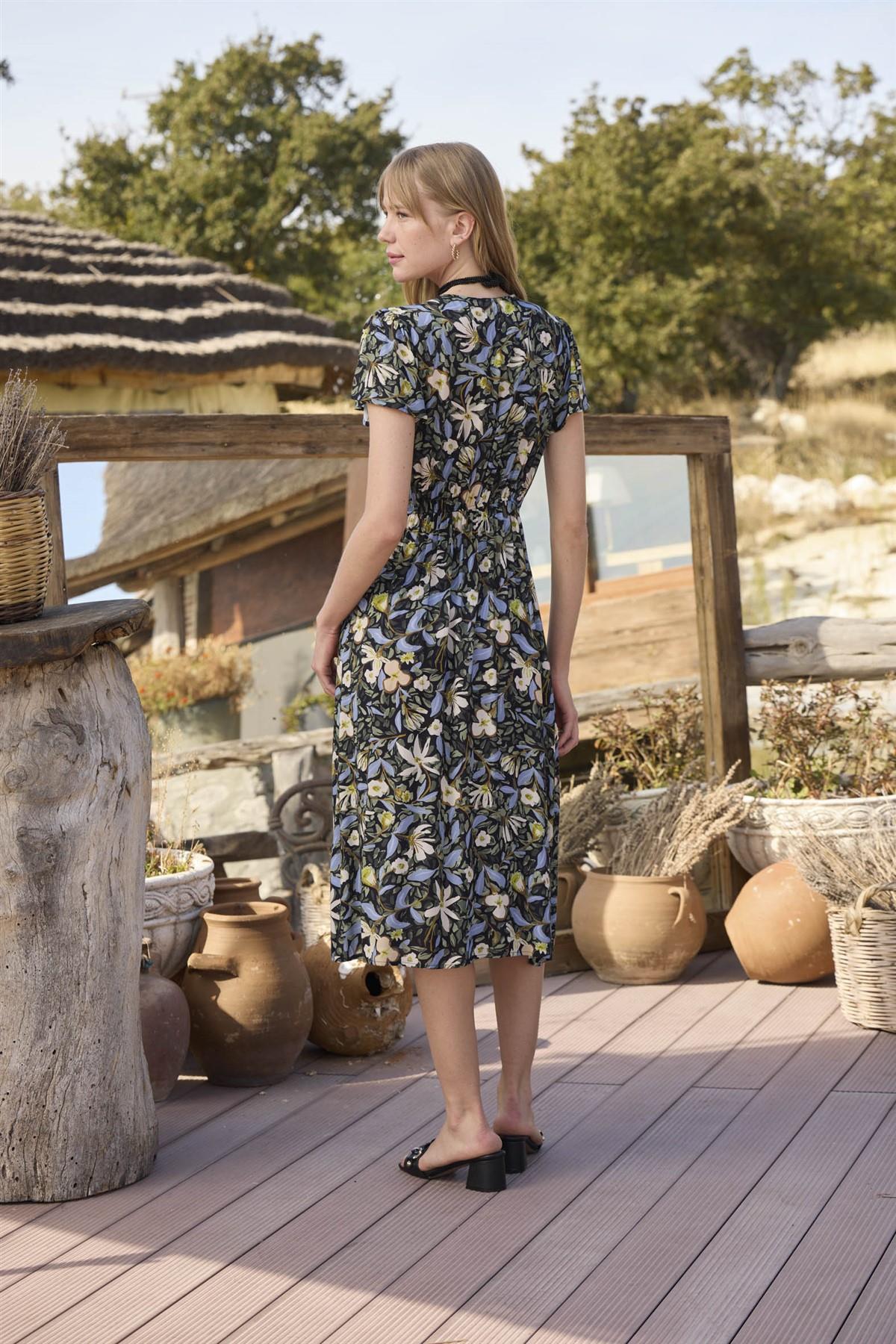 Arias Closet %100 Viskon Çiçek ve Yaprak Desenli Kısa Kollu Elbise