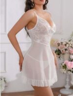Beyaz Fırfırlı Dantel İşlemeli İnce Askılı Likralı Fantezi Tül Gecelik, esnek likralı kumaşıyla vücudu nazikçe sarar ve konforlu bir kullanım sağlar. Hafif tül, zarif dantel işlemeleri ve şık fırfır detaylarıyla romantik ve baştan çıkarıcı bir görünüm sunar.