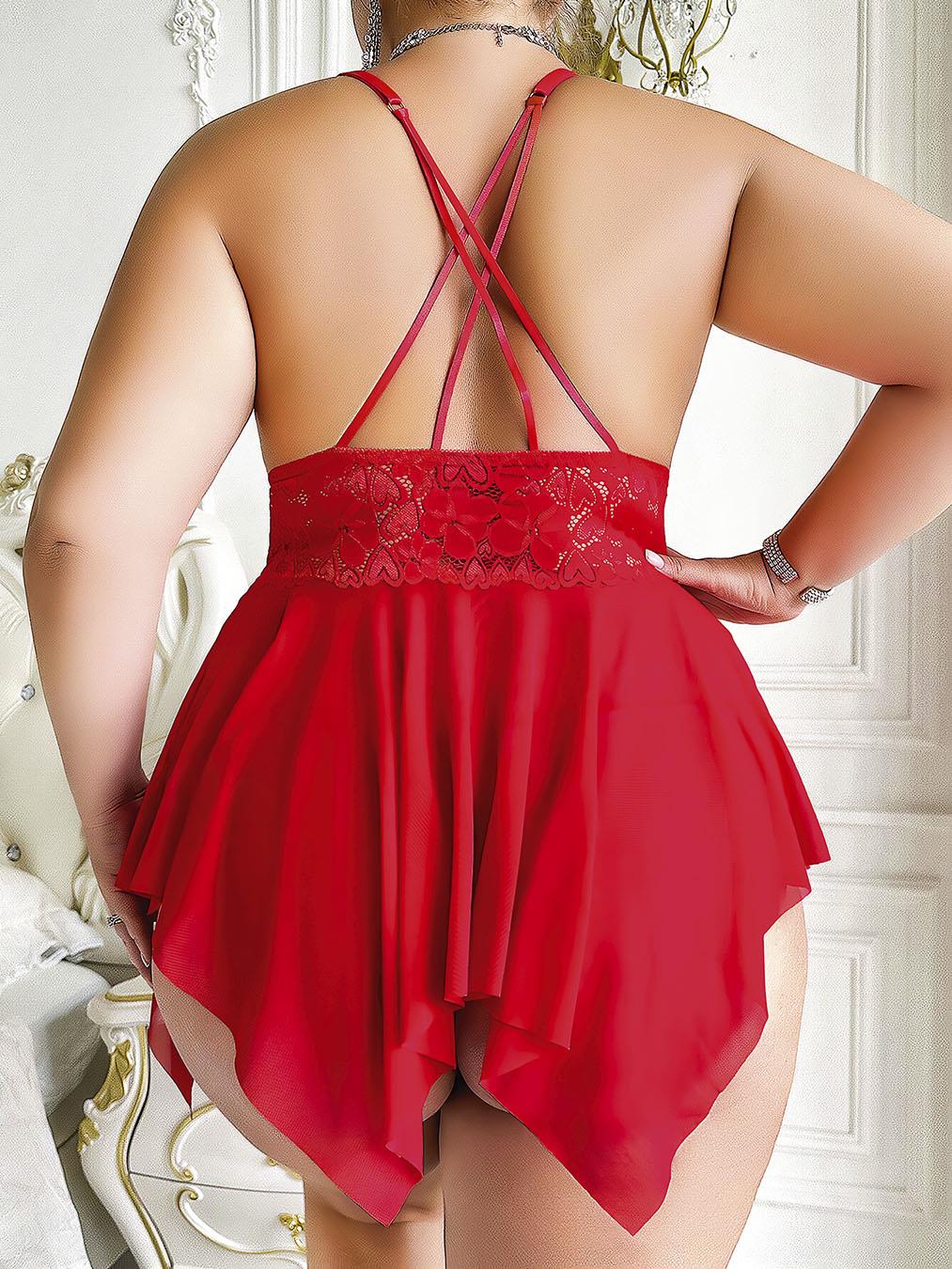 Büyük Beden Dantel İşlemeli Fırfırlı Dekolteli Fantezi Tül Kırmızı Gecelik, feminen detayları ve vücut hatlarını nazikçe saran tasarımıyla kendinizi özel hissetmenizi sağlar. Göğüs dekoltesini süsleyen dantel işlemeleri geceliğe romantik bir dokunuş katarken, fırfır detayları hareketli ve çekici bir görünüm sunar.
