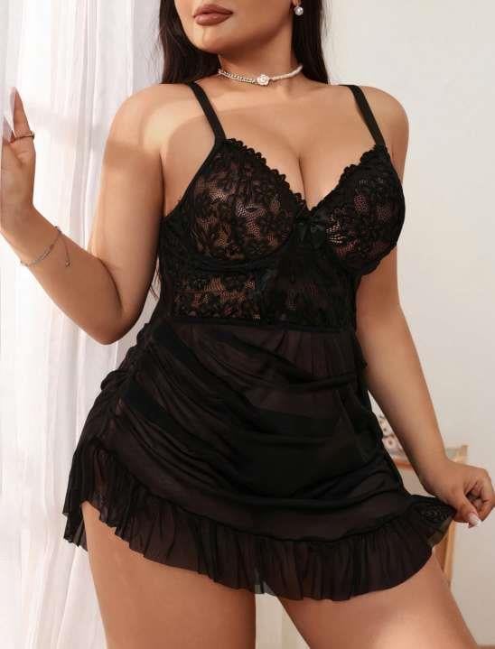 Büyük Beden Siyah Dantel İşlemeli Fırfırlı Tül Gecelik