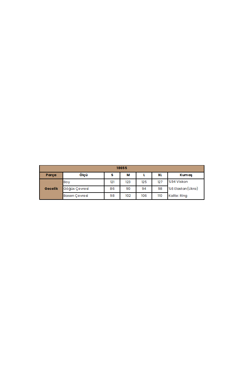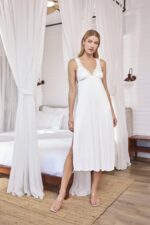 Gecelik: Beyaz renklidir, derin V Yakalıdır, göğüs ve sırt dekoltelidir, ip askılıdır, yakası, göğüs ve askı kenarları dantellidir, yırtmaçlıdır, örme kumaştır.