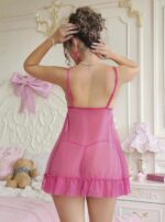 Arias Closet Fuşya Dantel İşlemeli Göğüs Dekolteli Fiyonklu Fantezi String Tül Gecelik Takımı