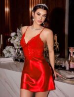 Kırmızı Dantel İşlemeli İnce Askılı Sırt Dekolteli Saten Mini Gecelik, cesur ve zarif detaylarıyla gecelerin en özel parçası olmaya aday. Parlak saten kumaşı teninizde ipeksi bir dokunuş bırakırken, zarif dantel işlemeleri feminen bir ışıltı kazandırır.