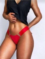 Bu özel tasarım V şeklindeki metal aksesuar ile minimal bir şıklık sunarken, vücut hatlarını zarifçe ortaya çıkaran string kesimi ile baştan çıkarıcı bir görünüm sağlıyor. Cesur ve feminen bir dokunuş için ideal.