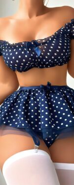 Lacivertin asil tonu, puantiyeli transparan detaylar ve fırfır etek tasarımıyla buluşarak hem eğlenceli hem de çekici bir stil sunuyor. Jartiyer detayı fantezi havasını güçlendirirken, hareketli fırfır etek feminen bir zarafet katar.