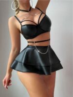 Özel Şık Tasarım Siyah Etekli Pileli Zincir Detay Fantezi Deri Elbise, cesur tasarımı ve dikkat çekici detaylarıyla güçlü bir görünüm sunar. Deri dokunun modern duruşu, pileli etek hareketi ve zincir detaylarıyla birleşerek elbiseye çarpıcı bir karakter kazandırır.