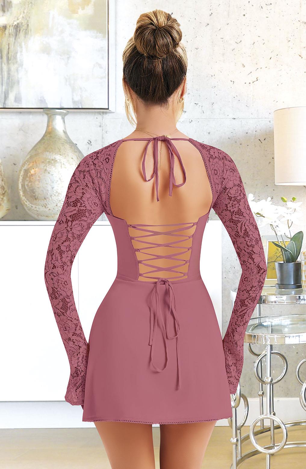 Arias Closet Özel Tasarım Dantel İşlemeli Şık Uzun Bolerolu Fuşya Fantezi Mini Club Elbisesi