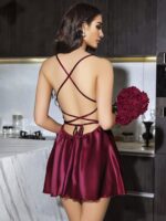 Özel Tasarım Sırt Dekolteli Sabahlıklı Saten Bordo 2’li Gecelik Takımı, akıcı saten dokusu ve asil bordo rengiyle gecelere sofistike bir şıklık katar. Sırt dekolteli ince askılı gecelik, feminen ve etkileyici bir görünüm sunarken, uyumlu sabahlık takımı zarafetle tamamlar.