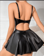 Siyah Etekli Pileli Göğüs Detaylı Fantezi Deri Elbise, iddialı tarzıyla dikkatleri üzerine çekmek isteyen kadınlar için tasarlandı. Parlak deri dokusu, pileli etek kesimi ve göğüs kısmındaki özel detaylarıyla feminen ve güçlü bir duruş sergiler.