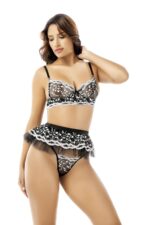 Siyahın zamansız cazibesi, desenli özel kumaş ve fırfır etek detayıyla buluşarak feminen ve baştan çıkarıcı bir stil sunuyor. Şık sütyen formu göğüsleri zarifçe toparlarken, string kesimi vücut hatlarını ön plana çıkarır.