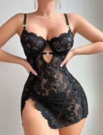 Siyah Full Dantel İşlemeli İnce Askılı Yırtmaçlı Likralı Fantezi Gecelik, esnek likralı kumaşıyla vücudu nazikçe sarar ve konforlu bir kullanım sağlar. Tüm gövdeyi saran dantel işlemeleri feminen ve sofistike bir görünüm kazandırırken, yırtmaç detayı cesur ve etkileyici bir duruş sunar.