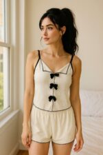 Askılı üstüyle hafif ve özgür bir kullanım sunarken, şort modeli sayesinde konforu ön planda tutar. Evde keyifli anlar, rahat uykular veya şık bir pijama partisi için ideal bir seçimdir.