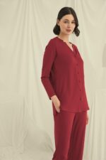 Üst: Kırmızı renklidir, V yakalıdır, önü boydan düğmelidir, uzun kolludur, örme kumaştır.