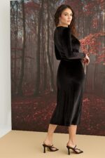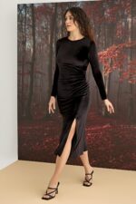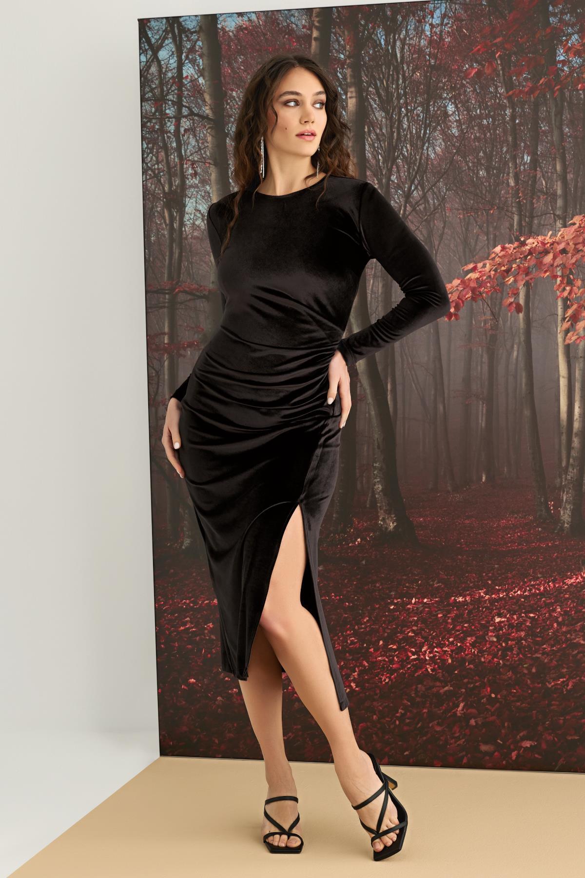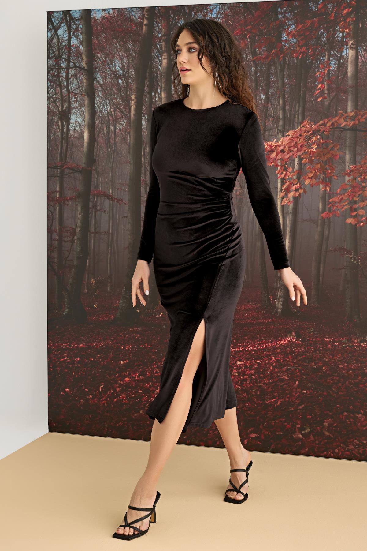 Arias Closet Uzun Kollu Yırtmaç Detaylı Kadife Elbise