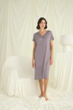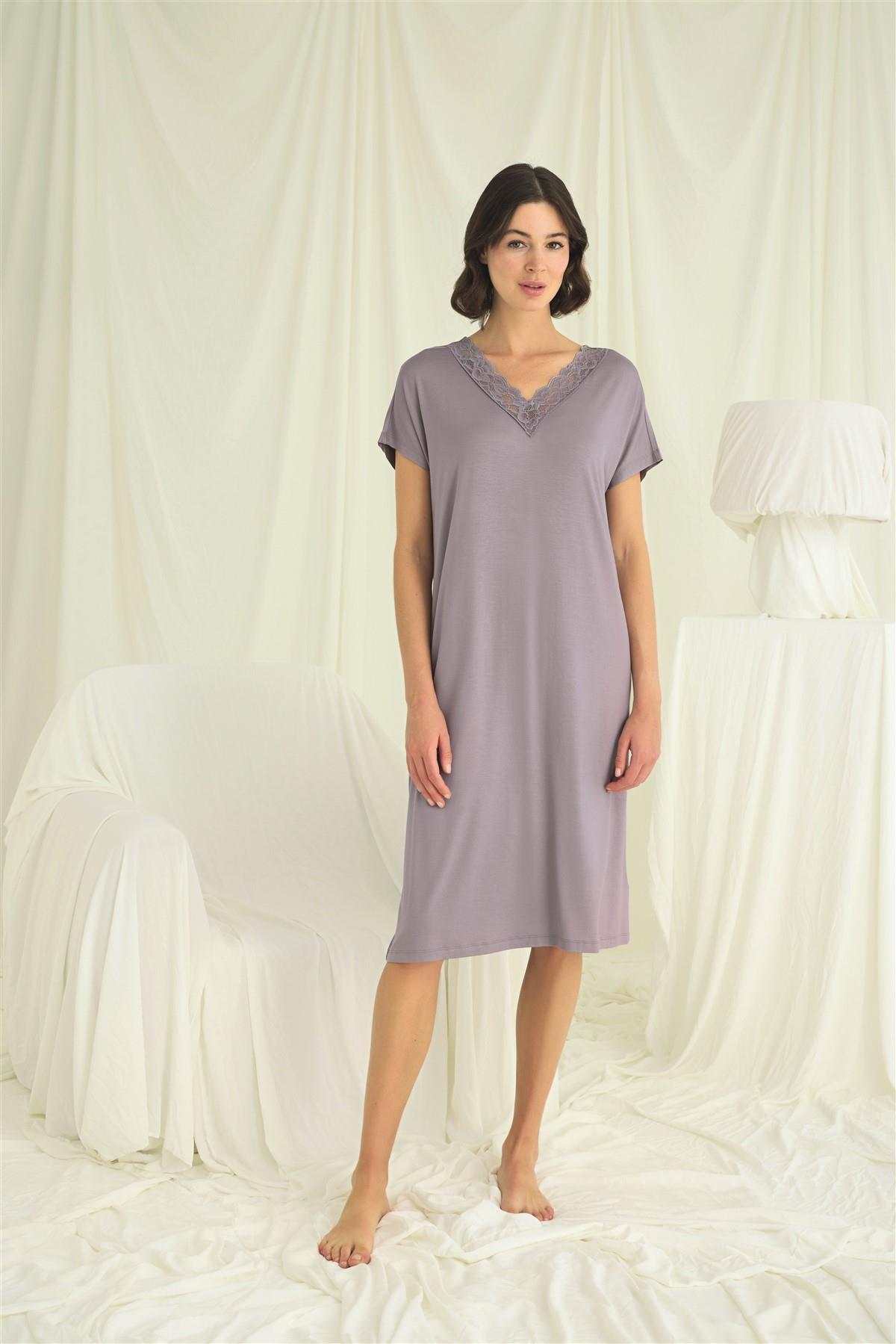 Gecelik: V yakalıdır, kısa kolludur, yakası dantellidir, Gri renklidir, örme kumaştır.