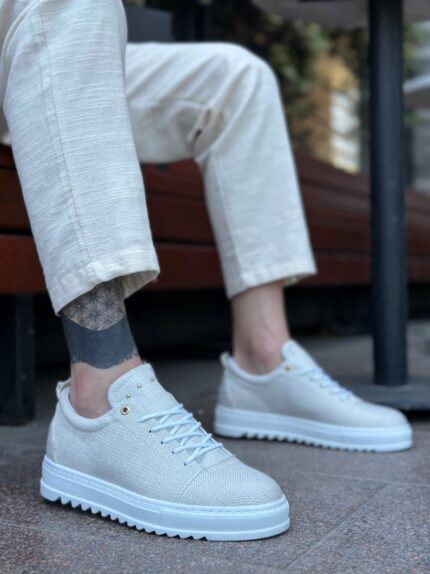 BA0152 Bağcıklı Yüksek Taban Krem Keten Erkek Ayakkabı