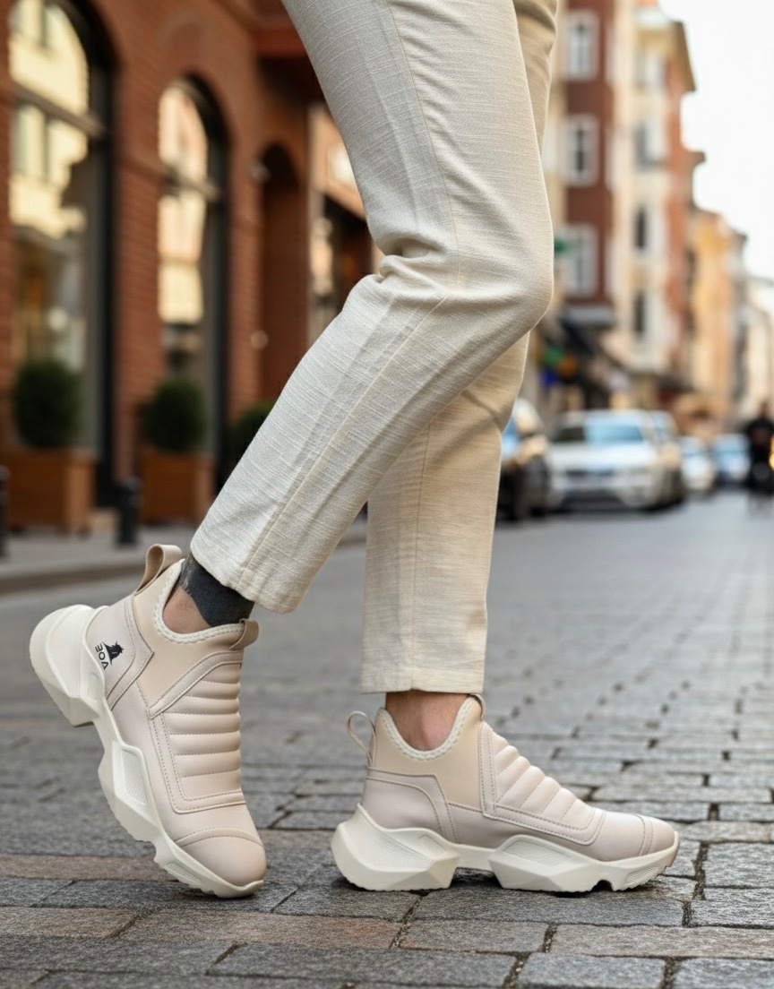 BA0401 Bağcıksız Rahat Yüksek Taban Krem Erkek Spor Yarım Bilek Bot