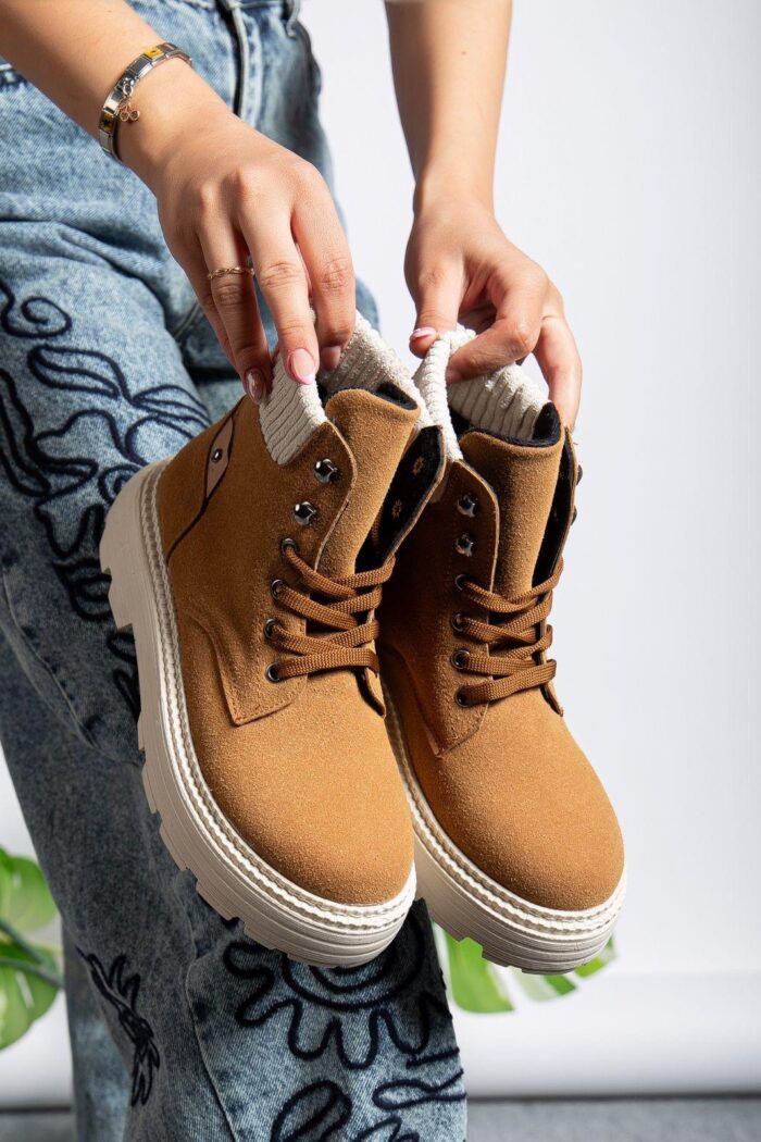 Camel Süet Bağcıklı Yüksek Taban Kadın Bot