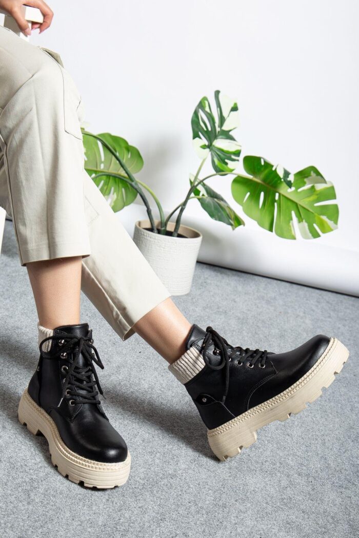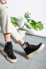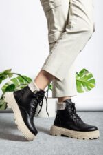 Siyah Cilt Bağcıklı Yüksek Taban Kadın Bot
