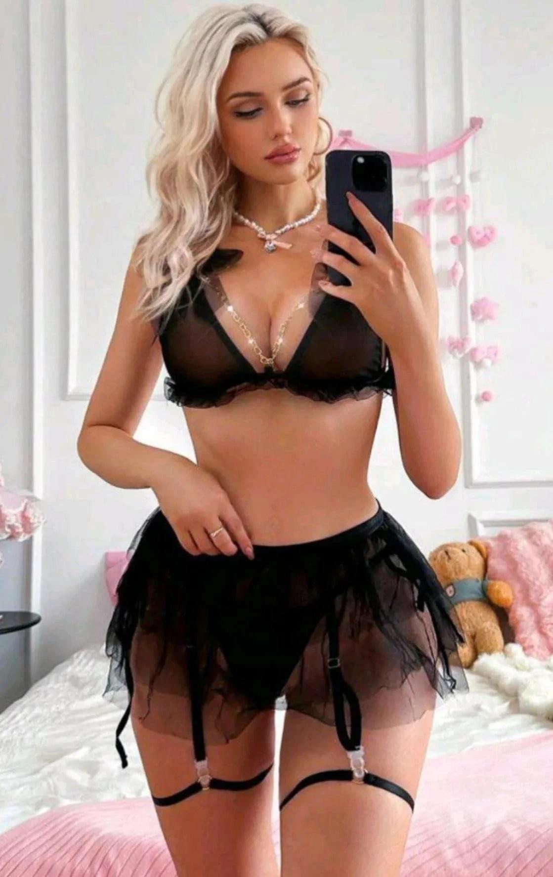Zarafetin ve cesaretin kusursuz birleşimi! Transparan tül dokusuyla büyüleyici bir siluet oluşturan bu özel jartiyer takımı, zincir detaylarıyla şıklığı bambaşka bir seviyeye taşıyor.